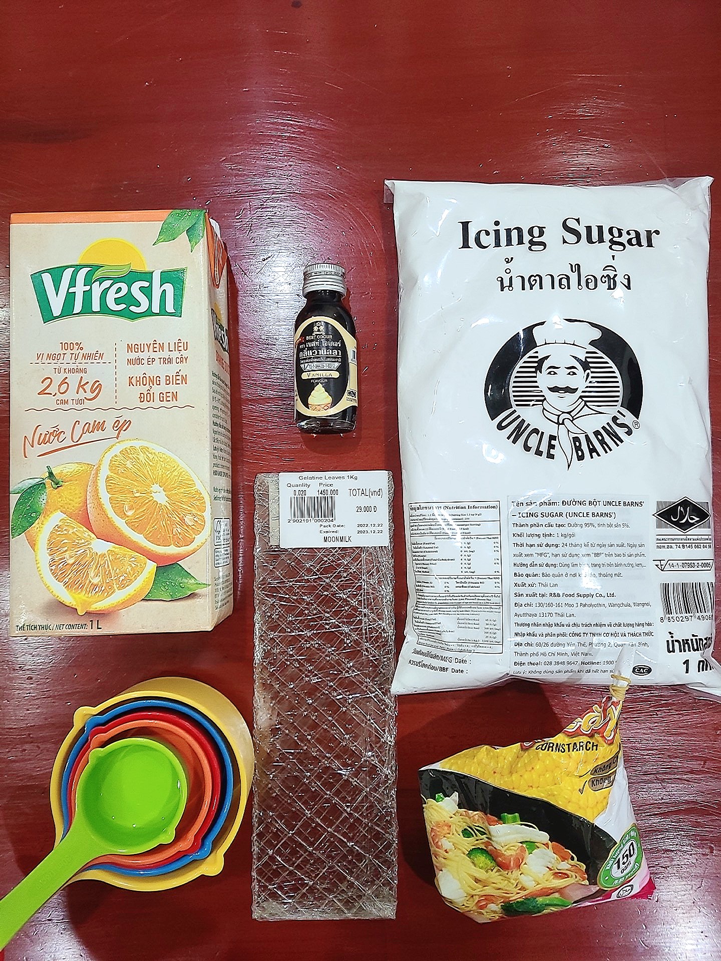 젤라틴 잎에 바닐라 에센스, 오렌지 주스. 슈가 파우더가 Moonmilk에도 안 보여서 그냥 포기할까 했는데, 아내가 엄청 구석에 있던 걸 하나 찾았다.