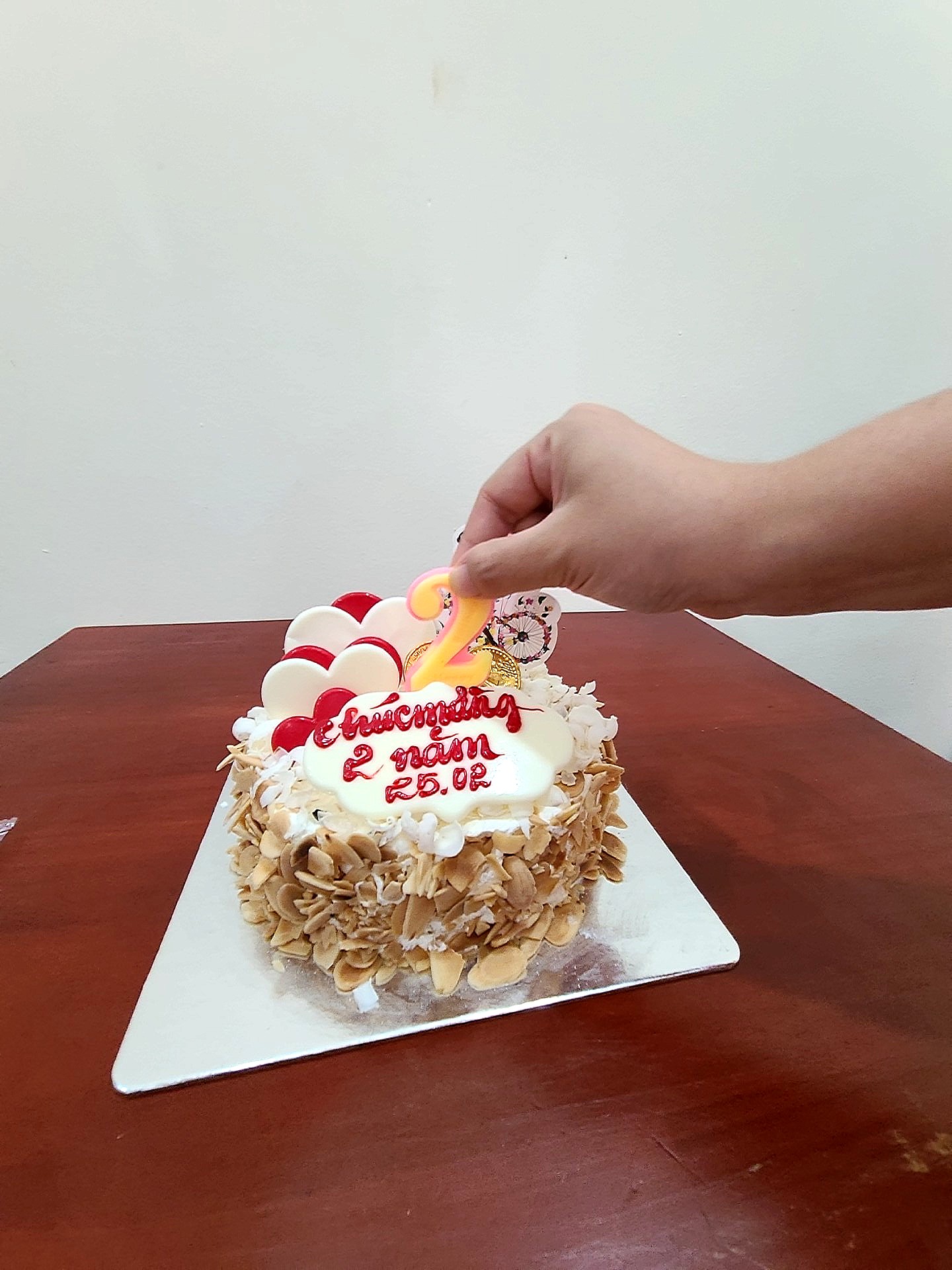 생일 축하는 충분하고, 우리 2주년을 기념하는 케이크로 하자고 강력하게 주장한 결과가 반영되었다.