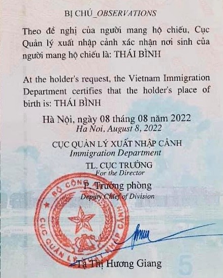 아무튼 그로 인해 베트남은 여권에 '출생지'를 추가하기로 했다. 또한 기존에 발급한 여권에는 '추가 기재'로 출생지를 등록해주는 방향으로 진행중이다.