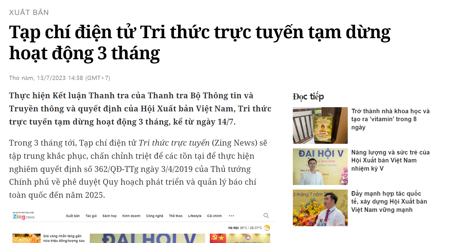 Theo thông báo của Tạp chí điện tử Tri thức trực tuyến (Zing News), đơn vị này sẽ ngừng hoạt động trong 3 tháng tới.