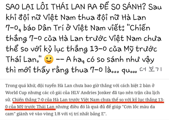 네덜란드전 7-0 패배에도 또 13-0을 가지고 왔다. 6-0으로 노르웨이에게 '개박살이 난' 필리핀에 대한 언급이 사라졌다. 심지어 베트남 본인들의 패배에는 thua tan nát도 muối mặt도 보이지 않는다.