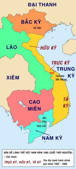 Trung Kỳ 지역 같은 경우는 1884년까지 세 지역으로 나누어 Hữu Kỳ(右圻), Trực Kỳ(直圻), Tả Kỳ(左圻)로 나누어서 관할했다.
