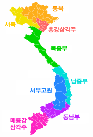 - 중부(Miền Trung) : 북중부(Bắc Trung Bộ), 남중부(Nam Trung Bộ), 서부고원(Tây Nguyên)