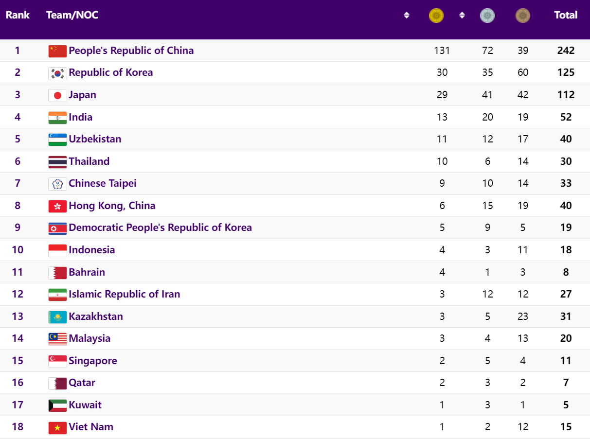 | 10월 2일 항저우 아시안게임 베트남의 메달과 순위 : 동메달 1개 추가 (1) | 2023.10.02 |