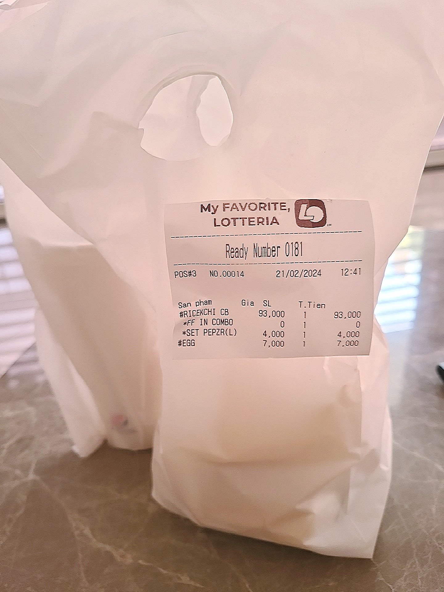 여러번 느끼는 거지만, 냐짱 롯데리아 통녓 지점은 1인분을 시키면 꼭 이렇게 주더라.